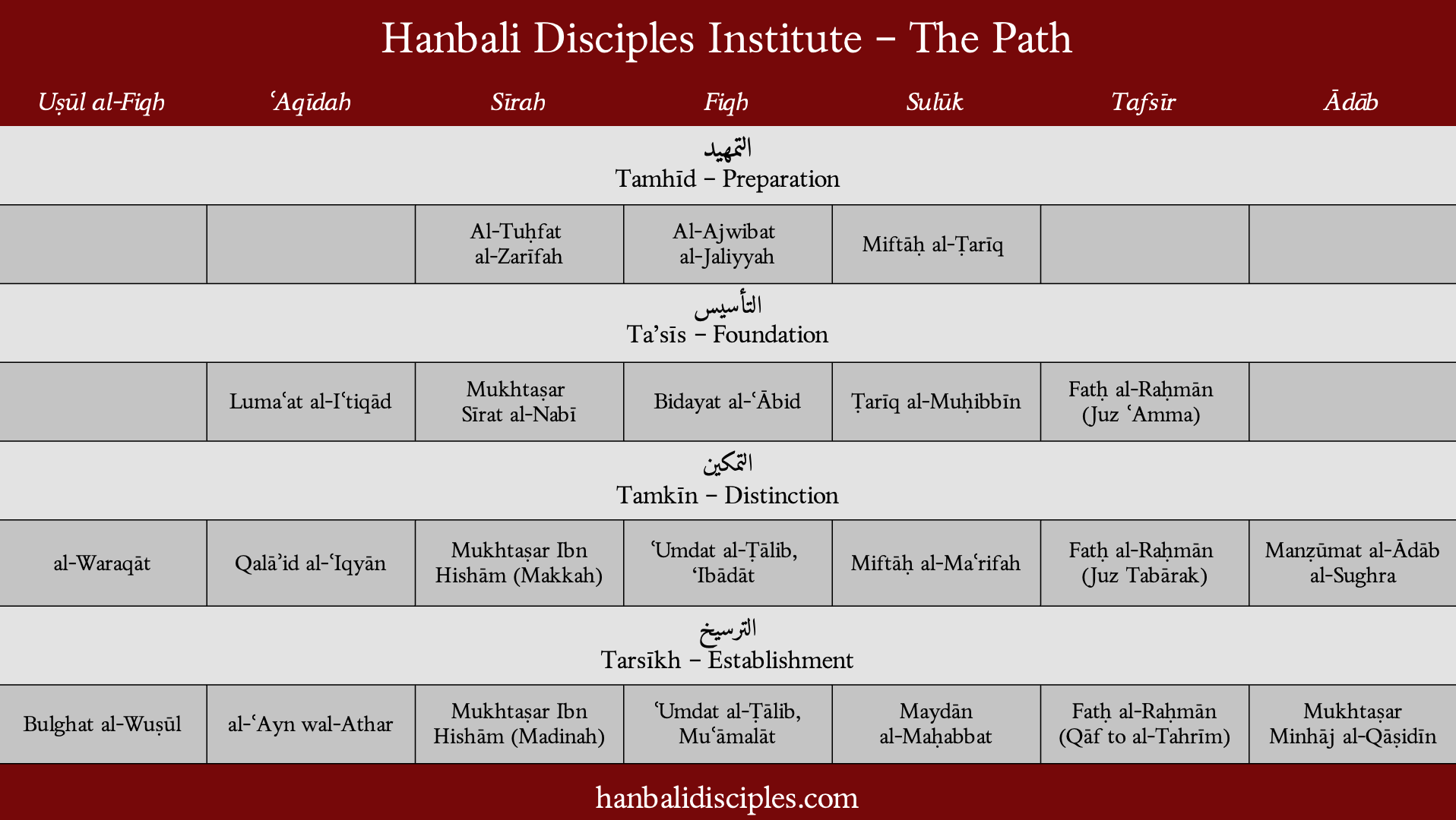 The Tamhīd level serves as the student’s formal introduction to the Hanbali tradition. It is designed to familiarize the seeker with the structure of traditional Islamic sciences, core vocabulary, and the methodology of studying sacred knowledge through guided texts. Students are introduced to three major disciplines: fiqh (jurisprudence), sīrah (Prophetic biography), and sulūk (spiritual wayfaring).